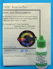 納米級微球顆粒標準品(Particle-Size Standards)直徑大小高度均一,具有NBS 的NIST認證,屬于Duke Scientific公司榮譽出品Nanosphere Size Standards™系列產(chǎn)品中的聚合體微球標準品(苯乙烯單體聚合而成)。