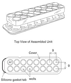 蓋玻片上的腔室共16個(gè),分2排,各8孔(如圖示),每孔的內(nèi)直徑6mm。設(shè)計(jì)的每孔體積和孔距與標(biāo)準(zhǔn)96孔板的相同,無細(xì)胞毒性的硅膠試劑壩(silicone well gasket)可以與上層聚苯乙烯材料的腔室(the upper structure,厚0.5mm)和基層的硼硅酸鹽蓋玻片(the substructure,厚0.16-.19mm)均形成密封。有上層腔室時(shí)每孔體積250µl,去掉上層腔室后每孔體積9µl。