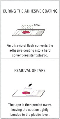 Glass slide with adhesive coating, when polymerized, bonds the still-frozen section from the tape to the slide. Avoid thawing the section. ½ x coating slides for mild to normal tissues.