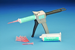 Sylgard 184硅橡膠(Kwik-Gard™Start Up kit)特別適合科學(xué)研究應(yīng)用??梢允∪セ旌蟽煞N膠帶來的麻煩和時間的浪費。當(dāng)推進(jìn)注射器時自動在尖部混合,無任何氣泡,直接用于位點。更換尖端就可以重復(fù)使用,有效避免了浪費。每針筒含有37ml的硅膠樹脂和固化劑,針筒頭(tip)的體積0.75ml。針筒內(nèi)的硅橡膠是Sylgard 184,液體組分組成的雙組分產(chǎn)品,包括硅膠組分與固化劑。硅膠組分與固化劑按10:1重量比完全混合,形成中等粘度混合液,混合液將固化成為具有韌性的透明彈性體,硅橡膠在25℃的溫度固化需要24h,無放熱現(xiàn)象,無需二次固化。