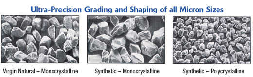Glennel®金剛石研磨膏可以分為天然單晶型、人造單晶型、人造多晶型三種(大小從1/10μm60μm)。這三種晶體的外形圖片見下: