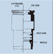 分劃板對潔凈度要求極高,任何微小的灰塵都會在觀測時產(chǎn)生很大的黑點,同時分劃板的安裝位置精度要求極高,因此,盡量不要拆卸,如果拆卸,一定要按原樣復(fù)原。選擇分劃板直徑必須與待用目鏡相匹配,并且直徑要略小于目鏡。不同的目鏡其分劃板內(nèi)置位置稍有差別。下圖給出內(nèi)置于開涅爾目鏡示意圖: