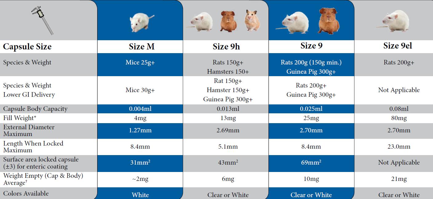 小動(dòng)物專用膠囊根據(jù)使用對(duì)象的個(gè)體大小分為四個(gè)級(jí)別:9el號(hào)、9號(hào)、9H和M號(hào)。9號(hào)適用于大鼠(體重150g以上)和豚鼠;M號(hào)適用于體重大于30g的小鼠。另外,9號(hào)還適用于大鼠(200g-250g)的肛腸給藥(是不是也要考慮包衣問題?)。考慮到9el號(hào)膠囊太大,不適合腸溶,就不給出包衣的指導(dǎo)面積了。