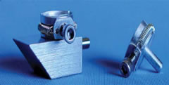 這種固定器是用來固定各種垂直的薄的樣本,它的直徑為25mm,厚度為10mm?;⒖谀軌驃A持最薄3mm厚的樣本。彈簧保證樣本垂直,以便對它的橫截面進行研究。這種固定器對于研究硅片橫截面是非常有幫助的。通過適配銷和你的儀器連接。
